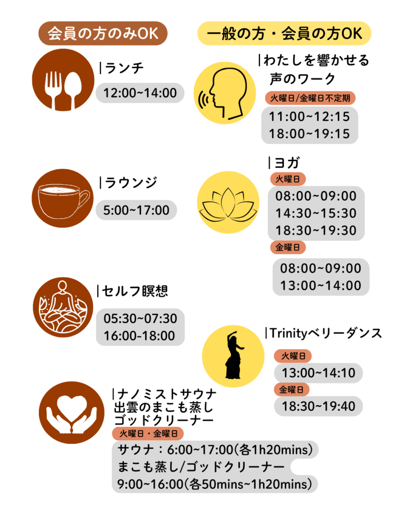 読書や瞑想にふけるひととき、ヨガやベリーダンス、声のワークで身体を動かし震わせるひととき、